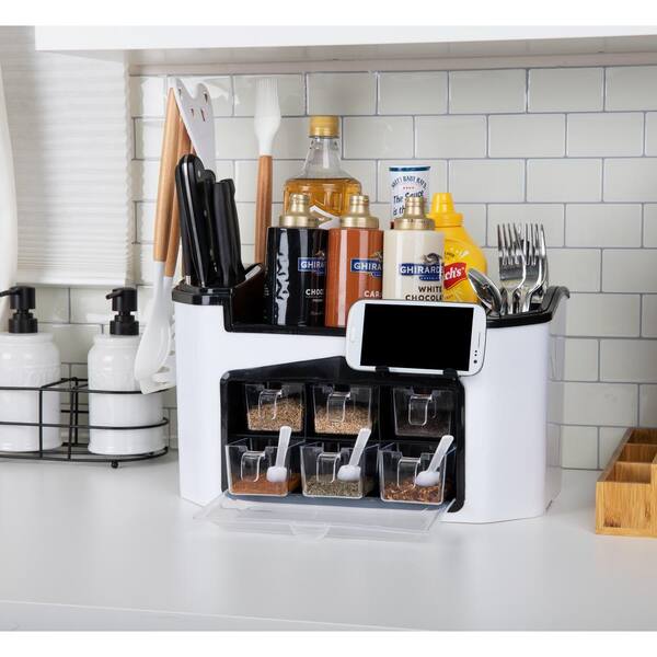 Mind Reader Kitchen Supply Organizer Spice Rack Condiment Storage Cutting Board Holder Drip Tray Multi Function Plastic White Sporg Wht